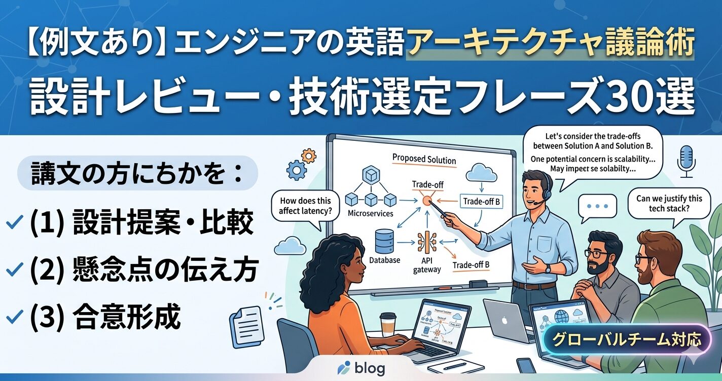 この記事では、エンジニアが実務で使える英語アーキテクチャ議論フレーズ30選をシーン別に解説する。設計提案の背景説明からトレードオフ比較・懸念点の伝え方・合意形成まで完全網羅した。