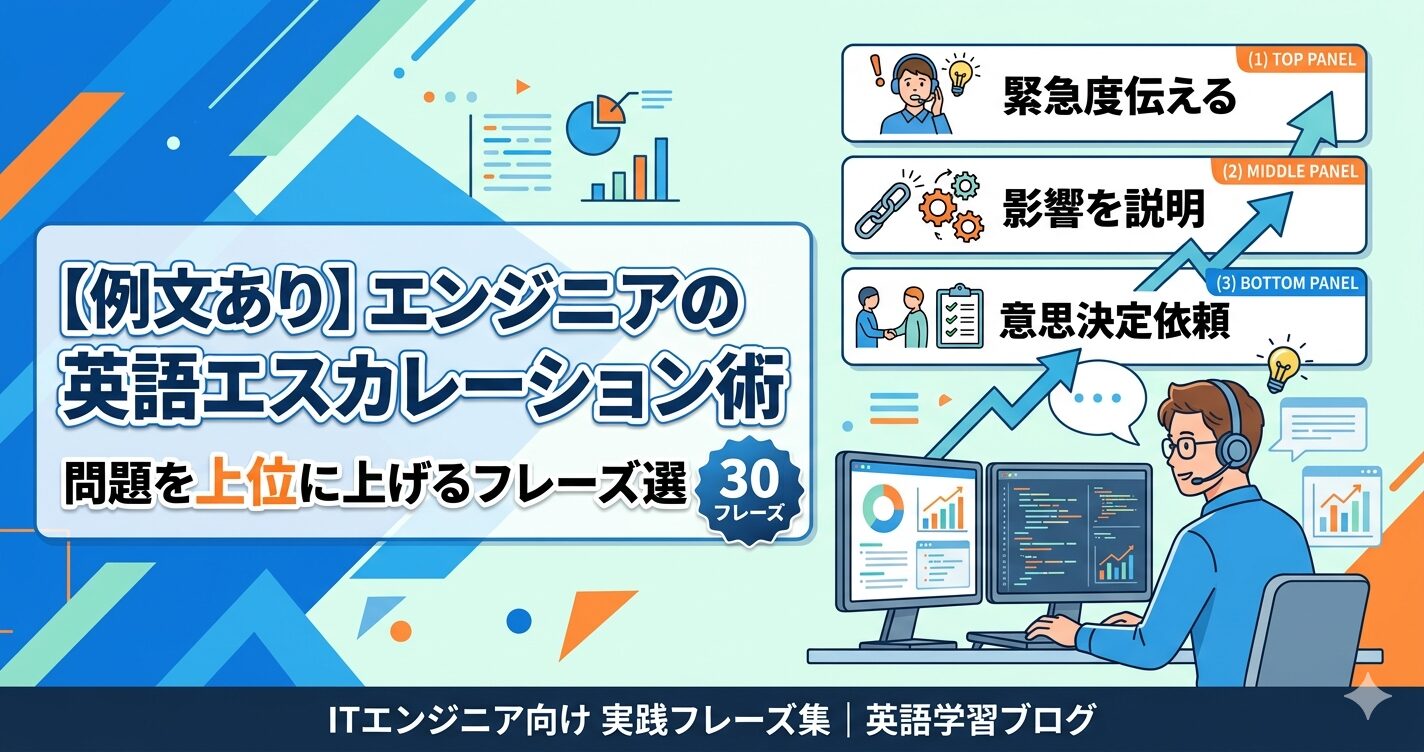 エスカレーションの背景となるステークホルダーへの報告・リスク説明フレーズは、エンジニアの英語ステークホルダー報告術も参考にしてほしい。