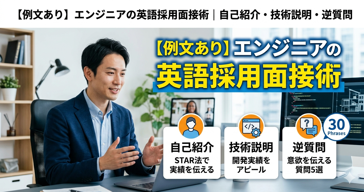 「自己紹介を英語でどう話せばいい?」「技術経験を英語でうまく説明できない」「逆質問で何を聞けばいい?」——こうした悩みは、フレーズと準備で解決できる。
