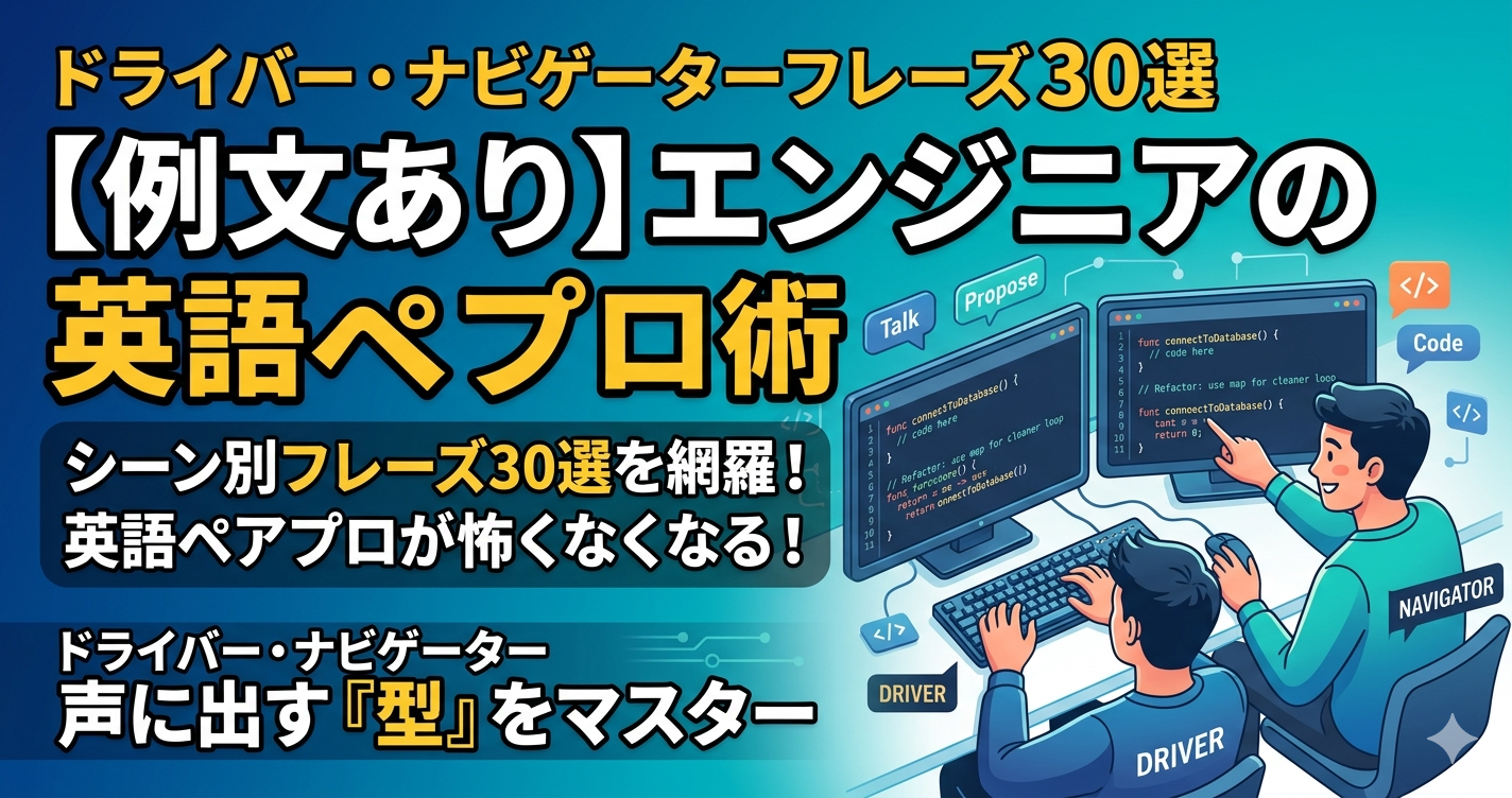 この記事では、エンジニアが実務で使える英語ペアプロフレーズ30選をシーン別に解説する。ドライバーの実況フレーズからナビゲーターの提案・セッション進行まで完全網羅した。