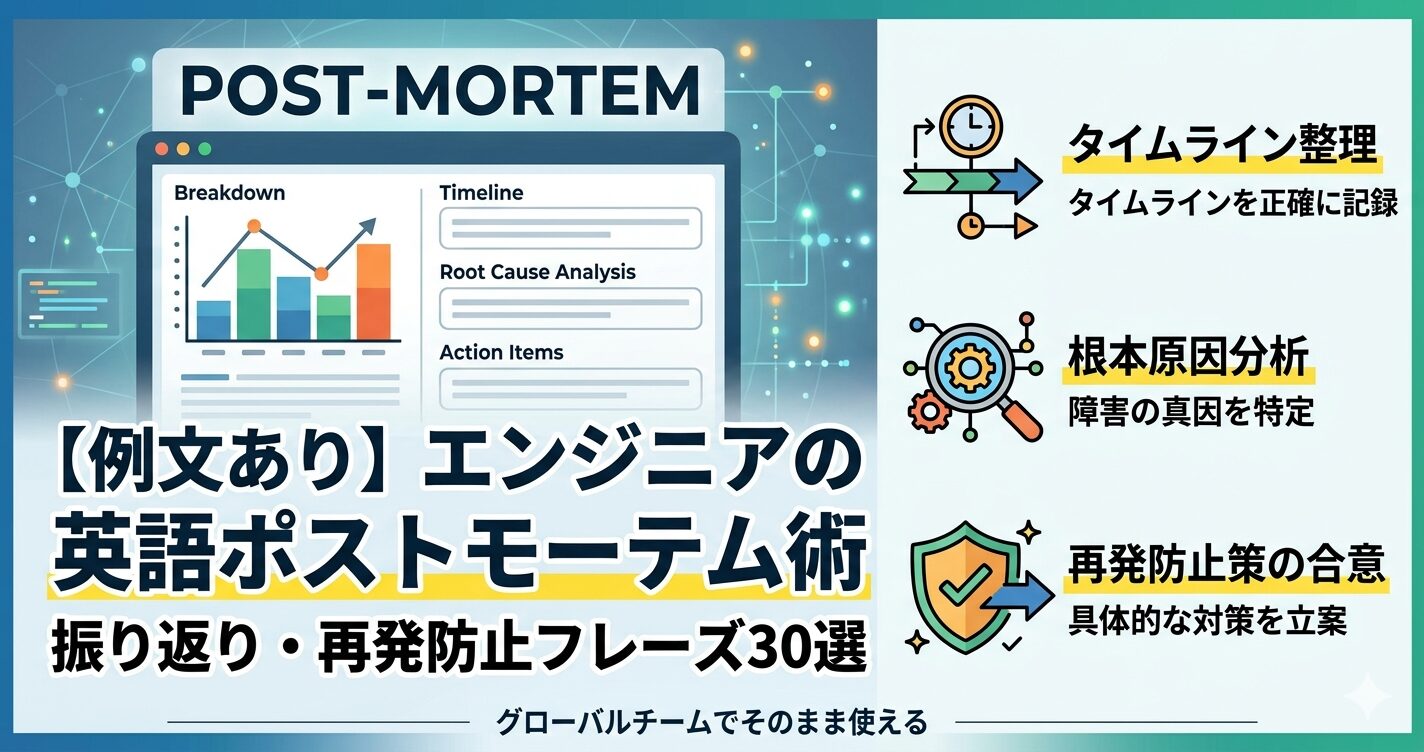 この記事では、エンジニアが実務で使える英語ポストモーテムフレーズ30選をシーン別に解説する。タイムライン整理から根本原因分析・影響説明・アクションアイテム合意まで完全網羅した。