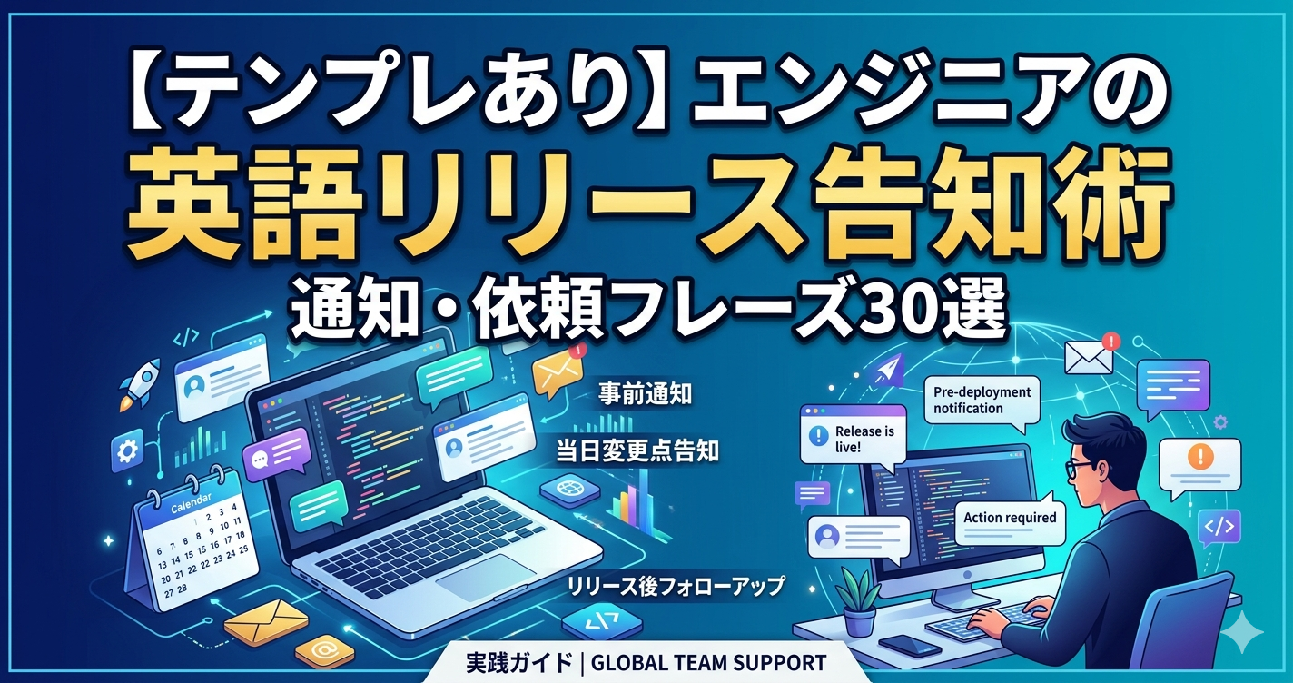 この記事では、エンジニアが実務で使える英語リリース告知フレーズ30選をシーン別に解説する。変更点の伝え方から対応依頼・問題発生時の連絡まで完全網羅した。