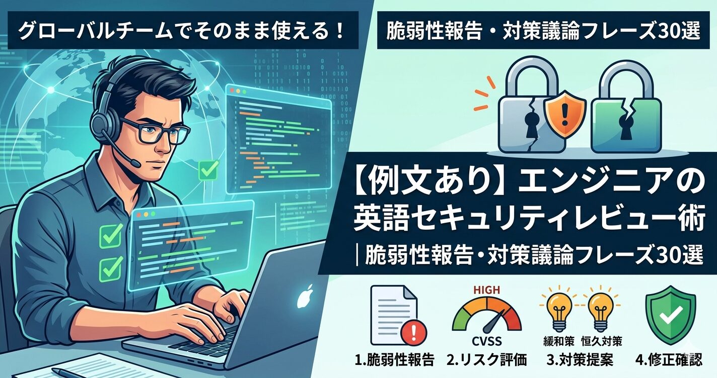セキュリティレビューの発見事項をSOC2・ISO27001の監査対応に繋げる場面では、エンジニアの英語セキュリティ監査・コンプライアンス対応術も参考にしてほしい。